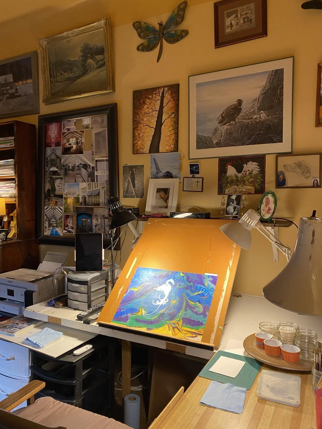 Welcome to J. Childs (Jaynè) Atelier, her residence for over 26 years, a lot of imagination built this amazing space from a giant white elephant, inspiring creativity to explode. Colours, shapes in a large assortment of materials, fuel this multi-medium artist’s palette.